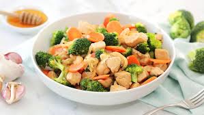 Stir-Fried Tofu with Vegetables & Brown Rice – Tofu (protein), mixed veggies (fiber), brown rice (fiber), and sesame oil (healthy fats).